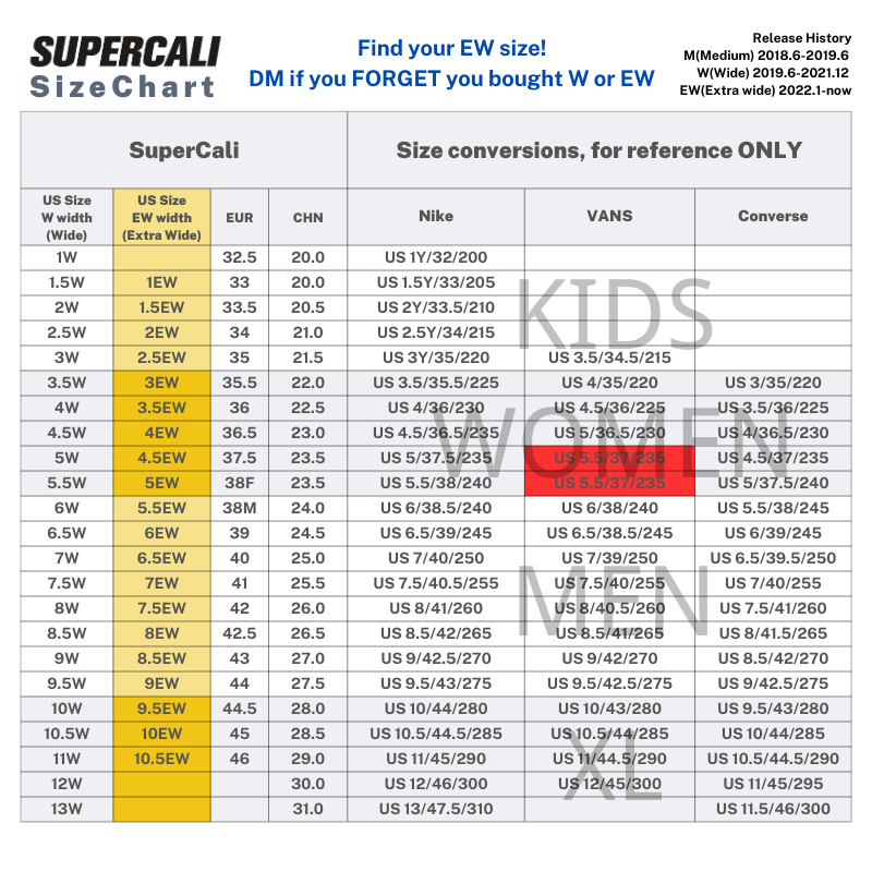 9W와 9EW를 비교하세요? - 9EW는 9W보다 훨씬 넓습니다. 9EW는 발가락을 더 앞으로 밀어서 반 사이즈 더 크게 느껴집니다. 그래서 9EW=9.5W입니다.